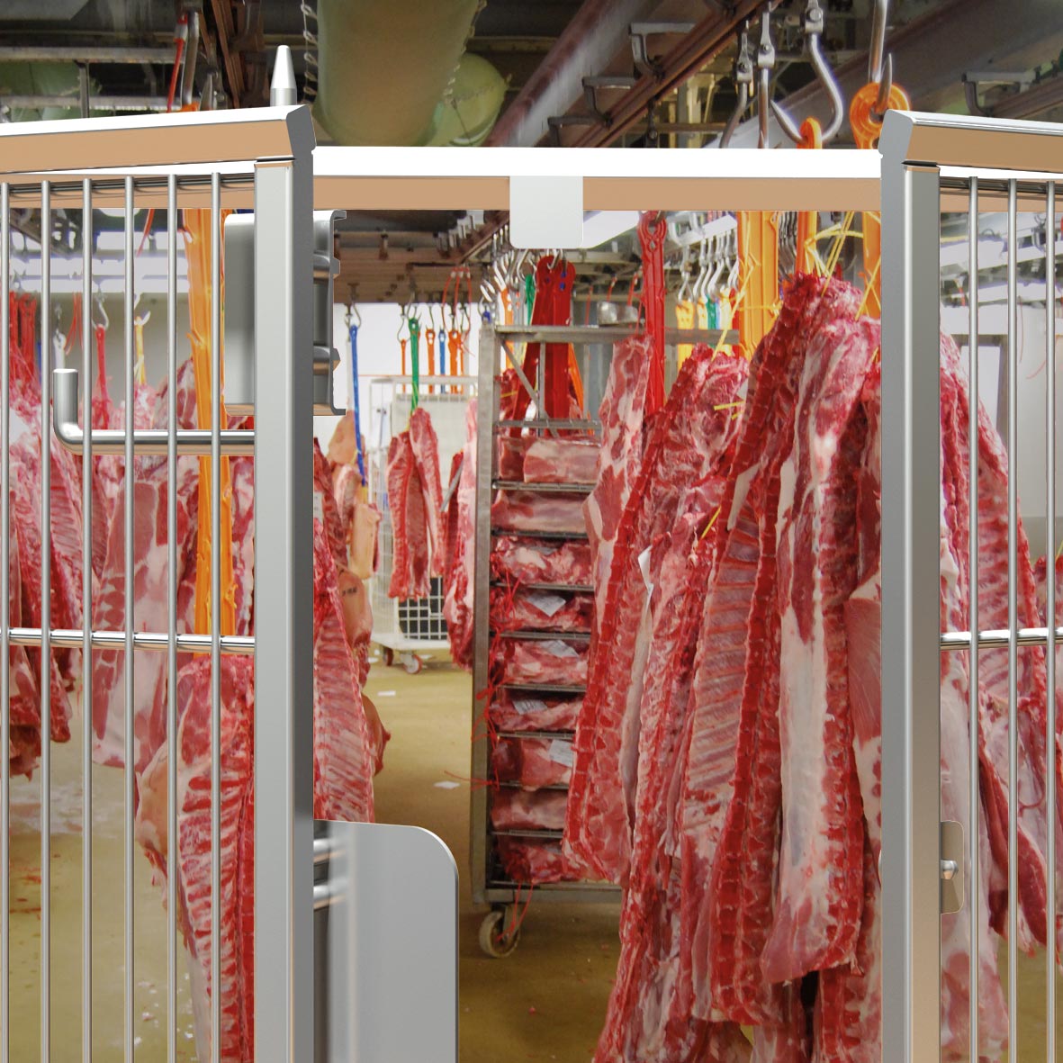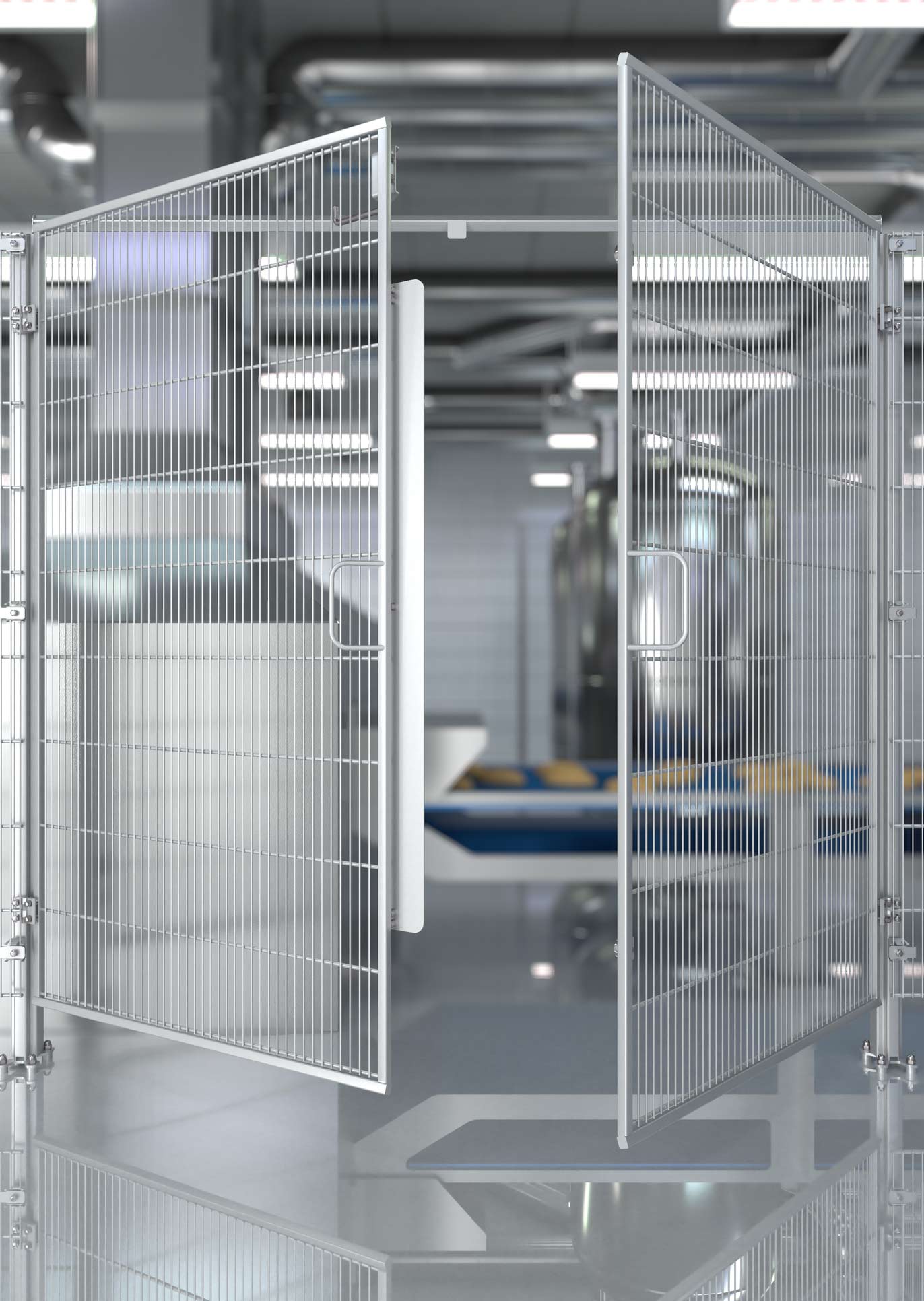 Die zweiflügelige Edelstahl Drehtür für Maschinenschutzgitter HYGIENEFENCE® ist vorgesehen für den Einsatz als feststehende trennende Distanzschutzeinrichtung (i.S.v. DIN EN 953) zum Schutz von Personen gegen das Erreichen von Gefahrstellen an Maschinen und Anlagen der Nahrungsmittelindustrie (z.B. Bäckereien, Pharmazie, Fleischwarenbetriebe, Käsereien, Molkereien).