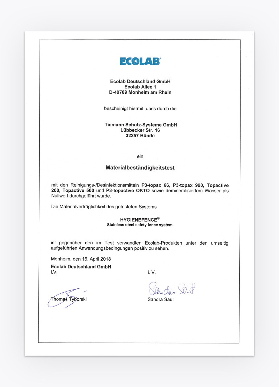 • ECOLAB Materialprüfung auf Verträglichkeit von Reinigungsmitteln